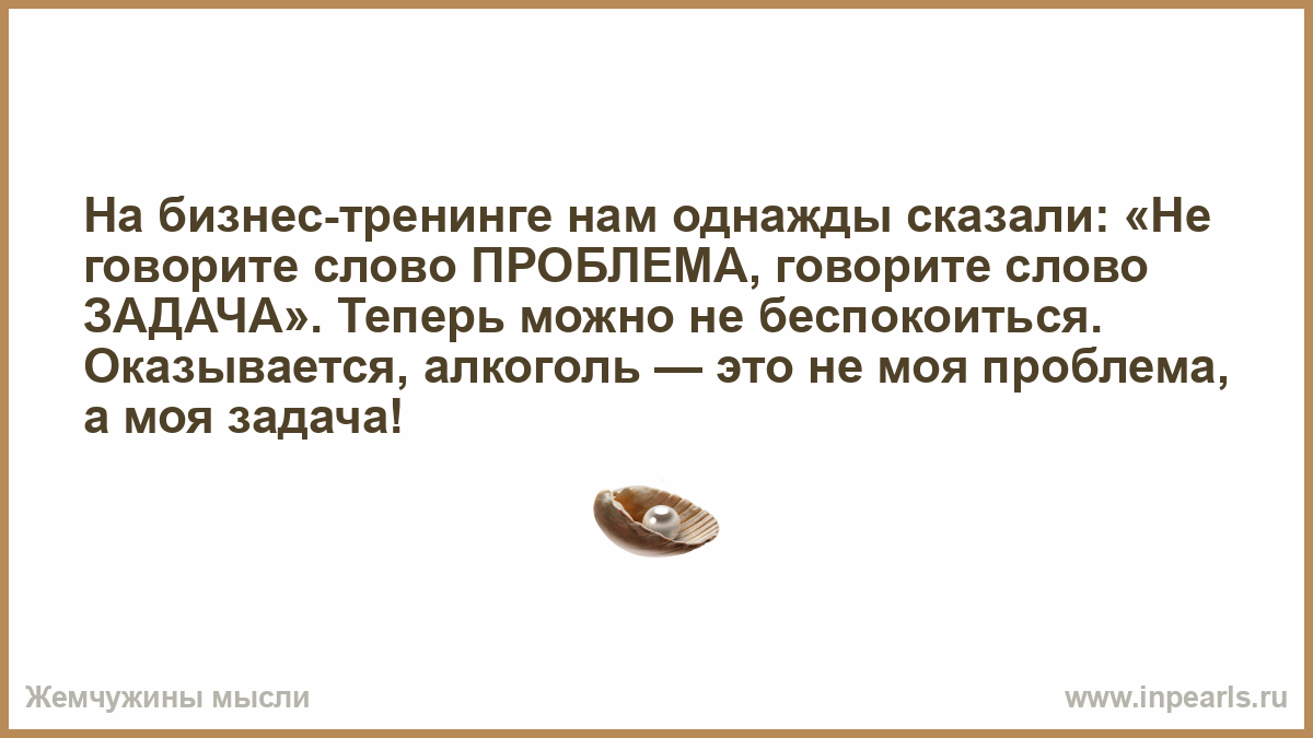 На бизнес-тренинге нам однажды сказали: «Не говорите слово ПРОБЛЕМА, говорите слово ЗАДАЧА». Теперь можно не беспокоиться. Оказывается, алкоголь — это не моя проблема, а моя задача!