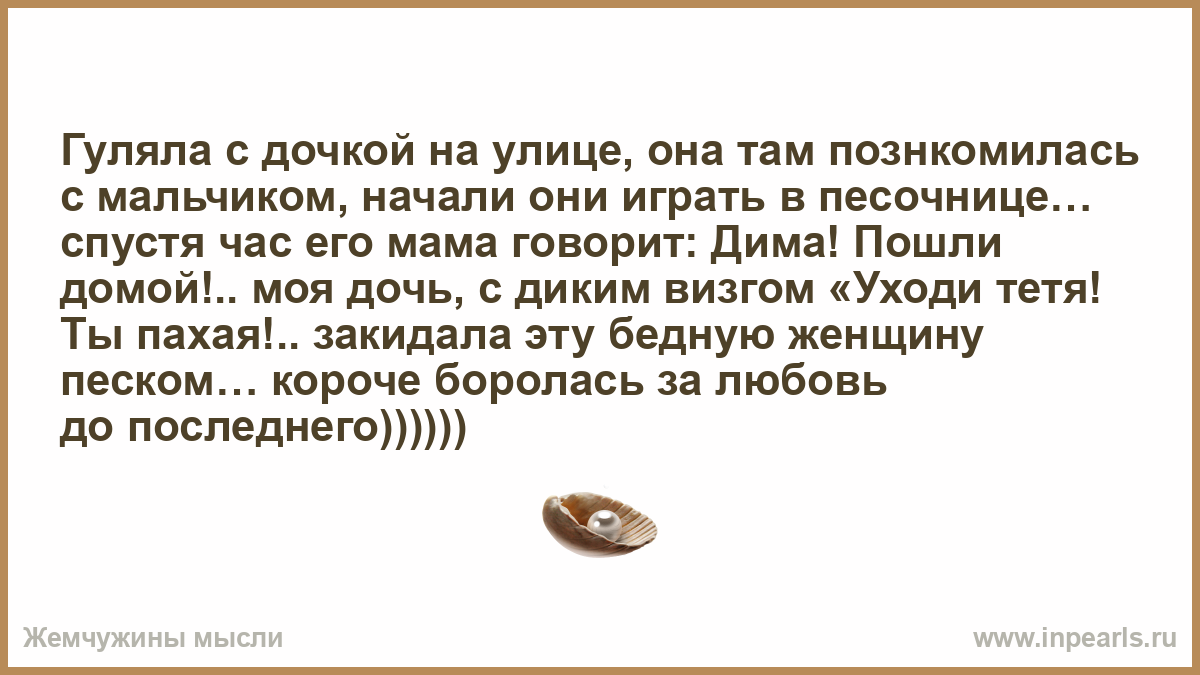 Гуляла с дочкой на улице, она там познкомилась с мальчиком, начали они играть в песочнице… спустя час его мама говорит: Дима! Пошли домой!.. моя дочь, с диким визгом «Уходи тетя! Ты пахая!.. закидала эту бедную женщину песком… короче боролась за любовь до последнего))))))