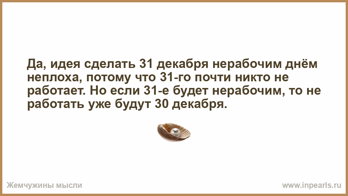 Да, идея сделать 31 декабря нерабочим днём неплоха, потому что 31-го почти никто не работает. Но если 31-е будет нерабочим, то не работать уже будут 30 декабря.