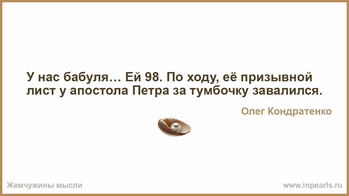 У нас бабуля… Ей 98. По ходу, её призывной лист у апостола Петра за тумбочку завалился.