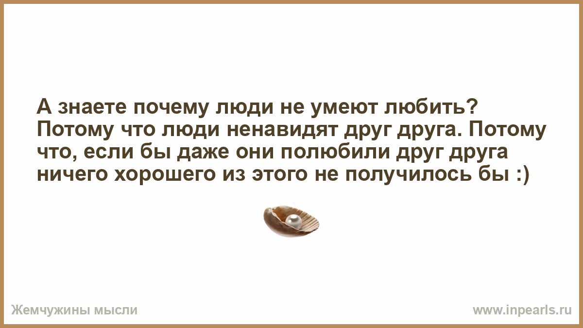 А знаете почему люди не умеют любить? Потому что люди ненавидят друг друга. Потому что, если бы даже они полюбили друг друга ничего хорошего из этого не получилось бы :)
