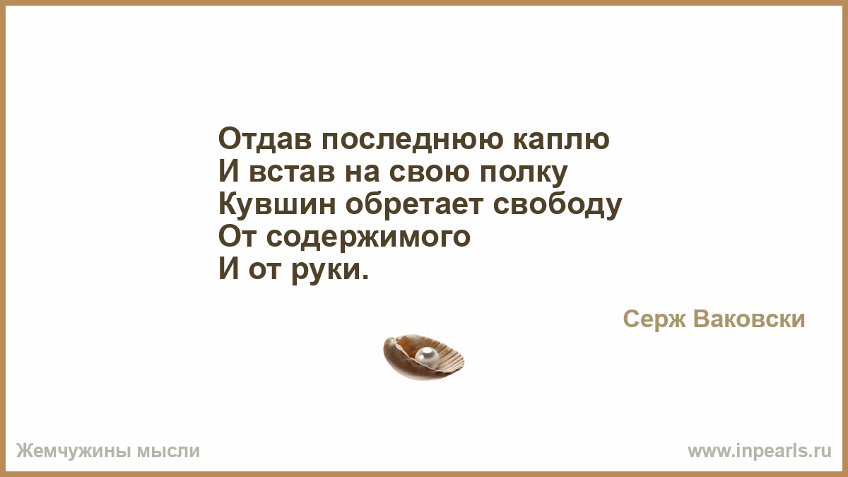 Отдав последнюю каплю И встав на свою полку Кувшин обретает свободу От содержимого И от руки.