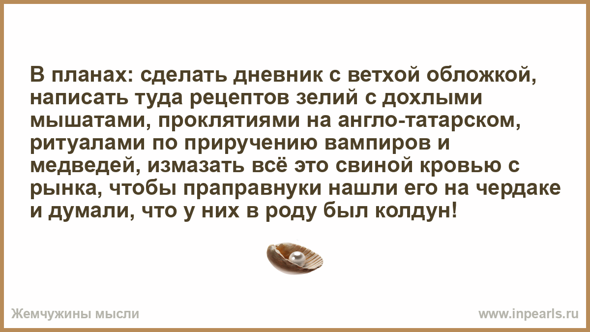 В планах: сделать дневник с ветхой обложкой, написать туда рецептов зелий с дохлыми мышатами, проклятиями на англо-татарском, ритуалами по приручению вампиров и медведей, измазать всё это свиной кровью с рынка, чтобы праправнуки нашли его на чердаке и думали, что у них в роду был колдун!