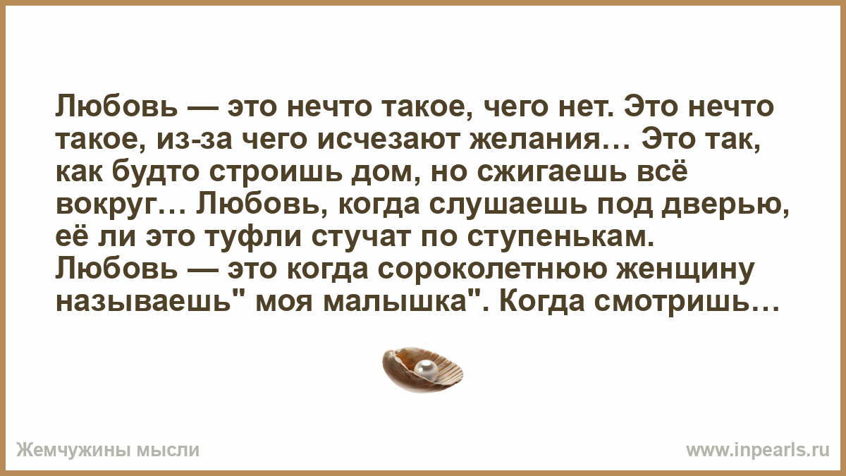 Любовь — это нечто такое, чего нет. Это нечто такое, из-за чего исчезают желания… Это так, как будто строишь дом, но сжигаешь всё вокруг… Любовь, когда слушаешь под дверью, её ли это туфли стучат по ступенькам. Любовь — это когда сороколетнюю женщину называешь" моя малышка". Когда смотришь когда она ест, а сам не можешь ничего проглотить, когда не сможешь заснуть, не проикоснувшись к её животу… Любовь — это, когда вы стоите под деревом, а ты мечтаешь, чтобы оно свалилось и ты сможешь заслонить её…