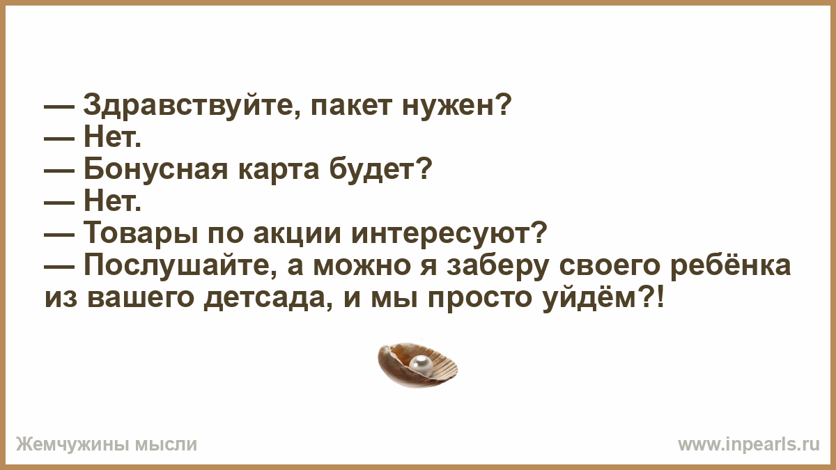 — Здравствуйте, пакет нужен? — Нет. — Бонусная карта будет? — Нет. — Товары по акции интересуют? — Послушайте, а можно я заберу своего ребёнка из вашего детсада, и мы просто уйдём?!