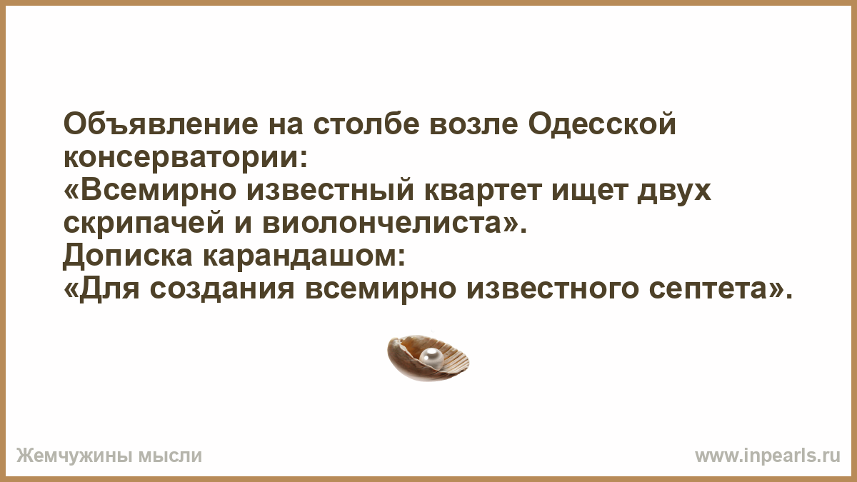 Объявление на столбе возле Одесской консерватории: «Всемирно известный квартет ищет двух скрипачей и виолончелиста». Дописка карандашом: «Для создания всемирно известного септета».