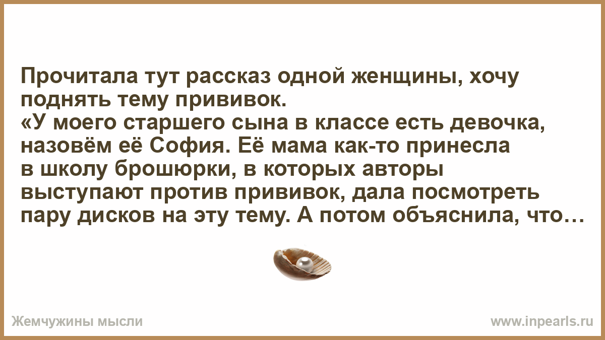 «У моего старшего сына в классе есть девочка, назовём её София. Её мама как-то принесла в школу брошюрки, в которых авторы выступают против прививок, дала посмотреть пару дисков на эту тему. А потом объяснила, что неслучайно стала противницей прививок, рассказала свою историю.
