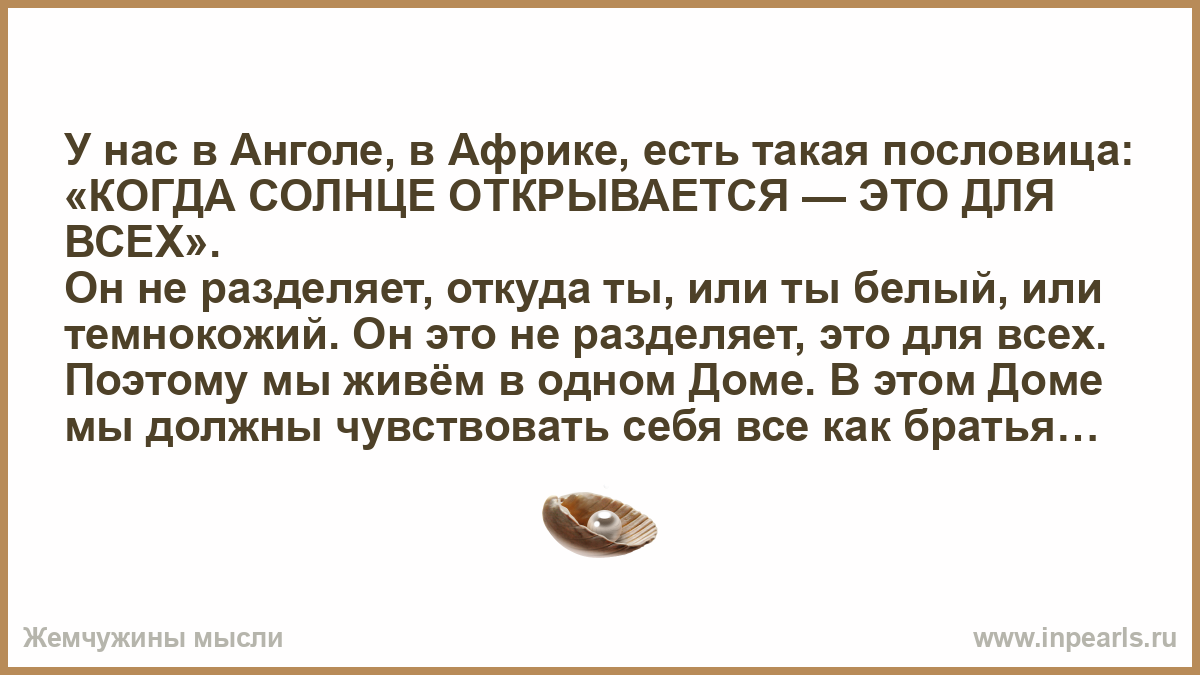 У нас в Анголе, в Африке, есть такая пословица: «КОГДА СОЛНЦЕ ОТКРЫВАЕТСЯ — ЭТО ДЛЯ ВСЕХ».