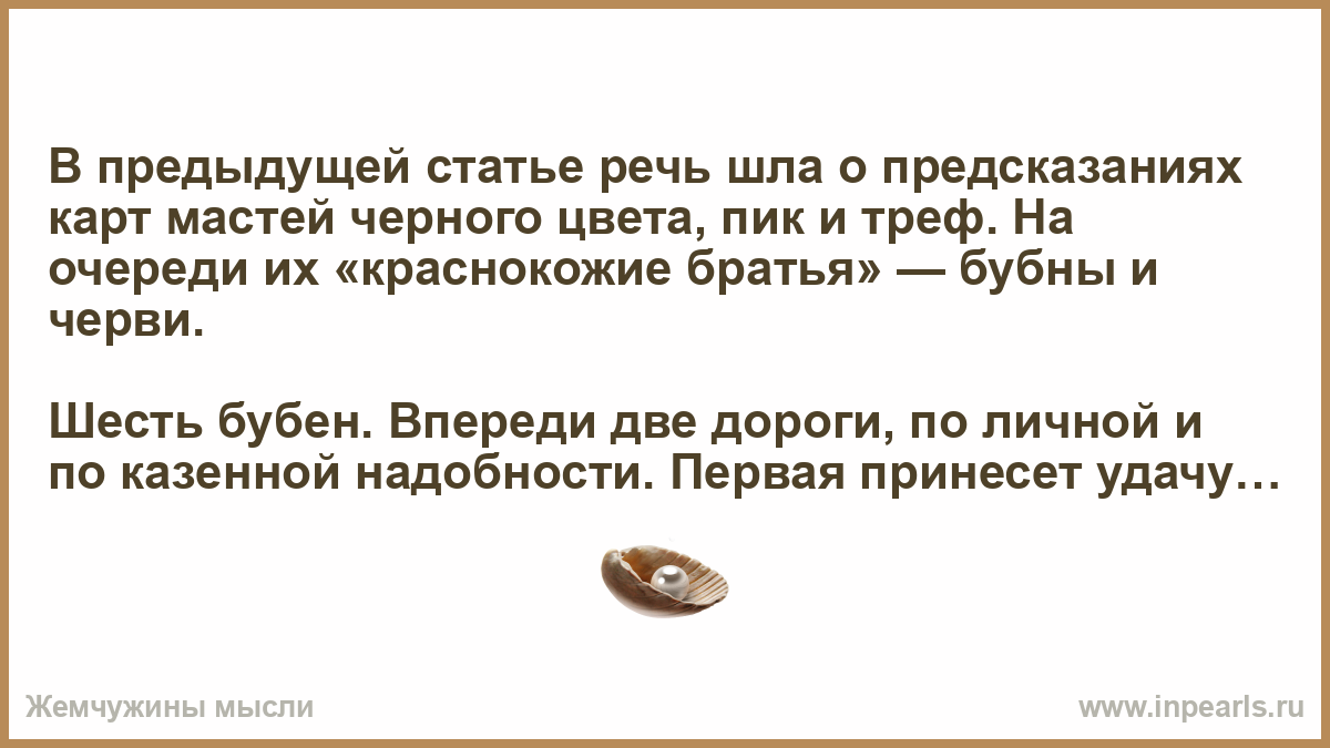 Шесть бубен. Впереди две дороги, по личной и по казенной надобности. Первая принесет удачу, а вторая грозит неприятностями. Причина в кознях тайного недоброжелателя. Присмотритесь, кому вы перешли дорогу на службе.