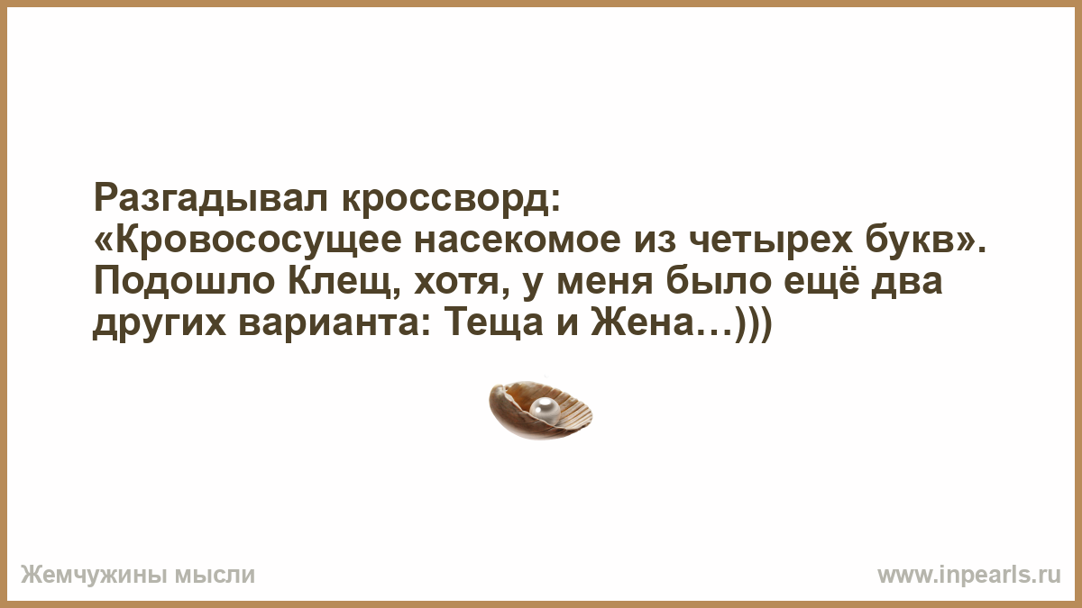 Разгадывал кроссворд: «Кровососущее насекомое из четырех букв». Подошло Клещ, хотя, у меня было ещё два других варианта: Теща и Жена…)))
