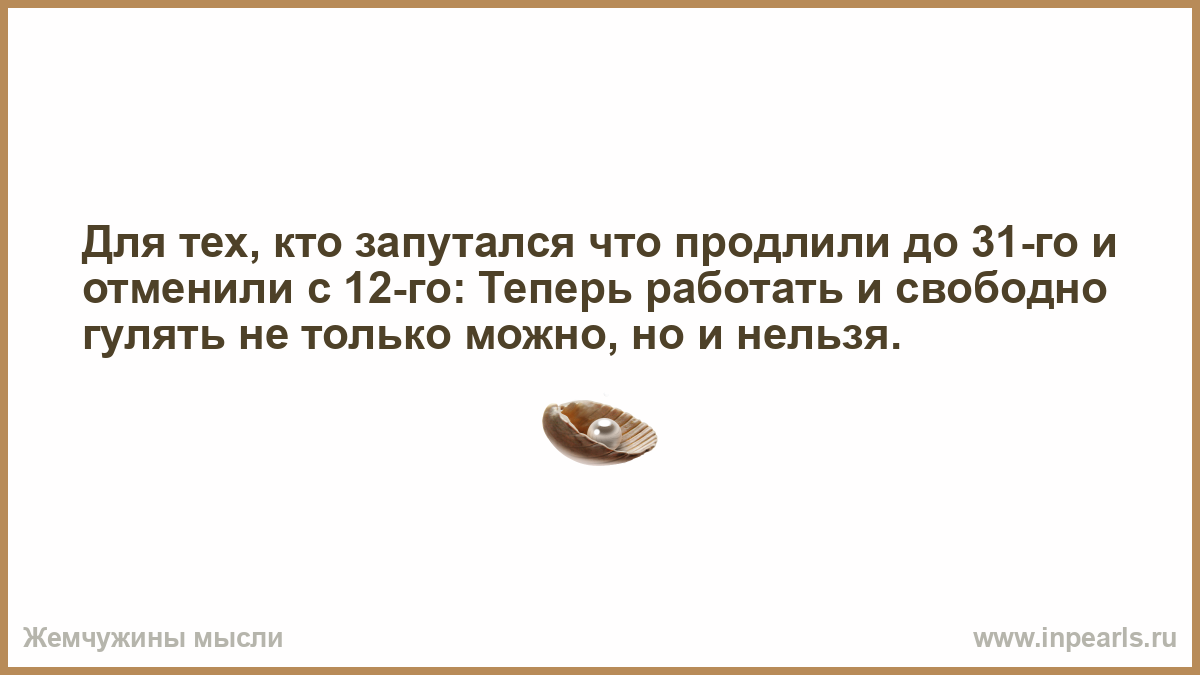 Для тех, кто запутался что продлили до 31-го и отменили с 12-го: Теперь работать и свободно гулять не только можно, но и нельзя.