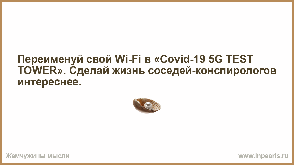 Переименуй свой Wi-Fi в «Соvid-19 5G ТЕSТ ТОWЕR». Сделай жизнь соседей-конспирологов интереснее.