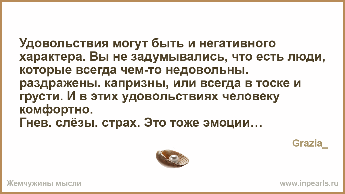 Удовольствия могут быть и негативного характера. Вы не задумывались, что есть люди, которые всегда чем-то недовольны. раздражены. капризны, или всегда в тоске и грусти. И в этих удовольствиях человеку комфортно.