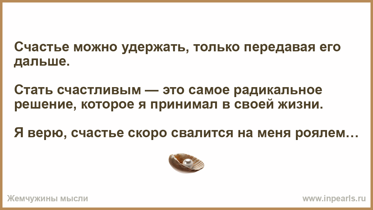 Счастье — это когда ты довольствуешься и ценишь то, что у тебя есть, и не гонишься за тем, чего в данный момент у тебя нет.