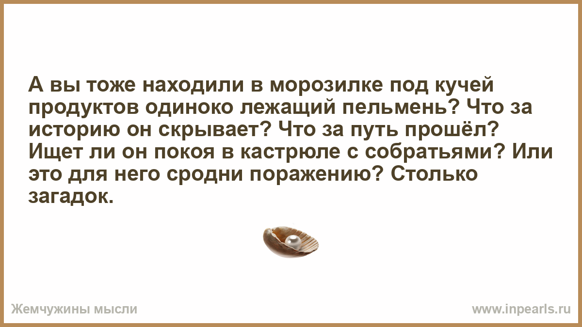 А вы тоже находили в морозилке под кучей продуктов одиноко лежащий пельмень? Что за историю он скрывает? Что за путь прошёл? Ищет ли он покоя в кастрюле с собратьями? Или это для него сродни поражению? Столько загадок.