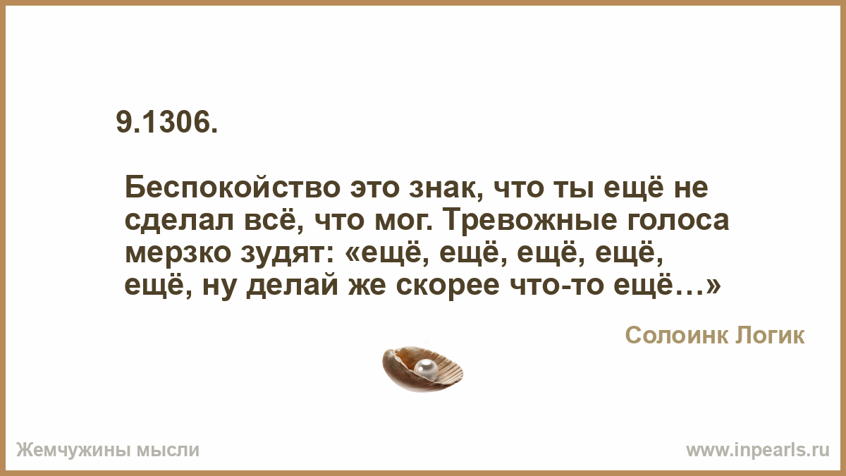 Беспокойство это знак, что ты ещё не сделал всё, что мог. Тревожные голоса мерзко зудят: «ещё, ещё, ещё, ещё, ещё, ну делай же скорее что-то ещё…»