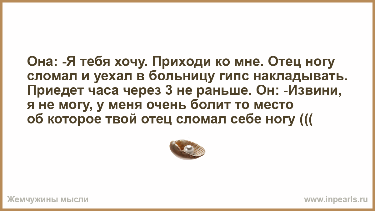 Она: -Я тебя хочу. Приходи ко мне. Отец ногу сломал и уехал в больницу гипс накладывать. Приедет часа через 3 не раньше. Он: -Извини, я не могу, у меня очень болит то место об которое твой отец сломал себе ногу (((