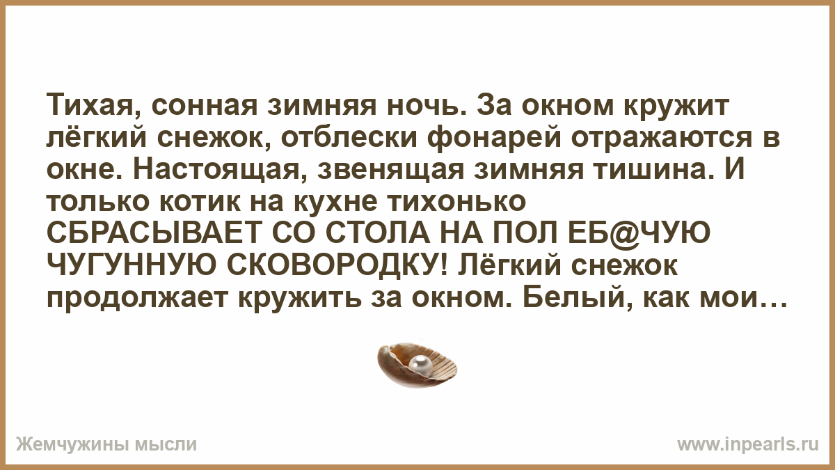Тихая, сонная зимняя ночь. За окном кружит лёгкий снежок, отблески фонарей отражаются в окне. Настоящая, звенящая зимняя тишина. И только котик на кухне тихонько СБРАСЫВАЕТ СО СТОЛА НА ПОЛ ЕБ@ЧУЮ ЧУГУННУЮ СКОВОРОДКУ! Лёгкий снежок продолжает кружить за окном. Белый, как мои волосы.
