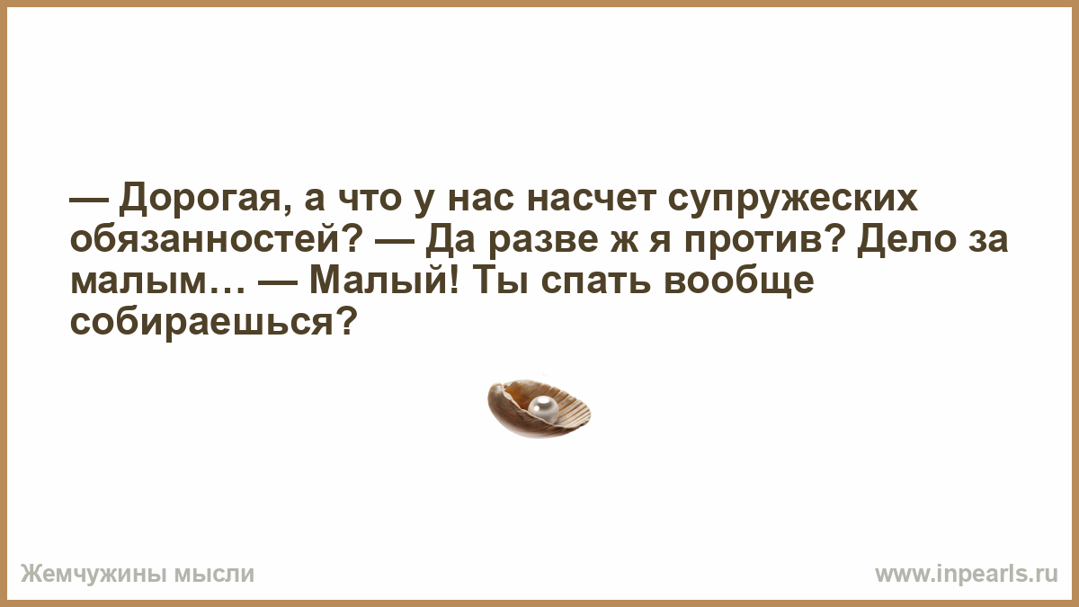 — Дорогая, а что у нас насчет супружеских обязанностей? — Да разве ж я против? Дело за малым… — Малый! Ты спать вообще собираешься?