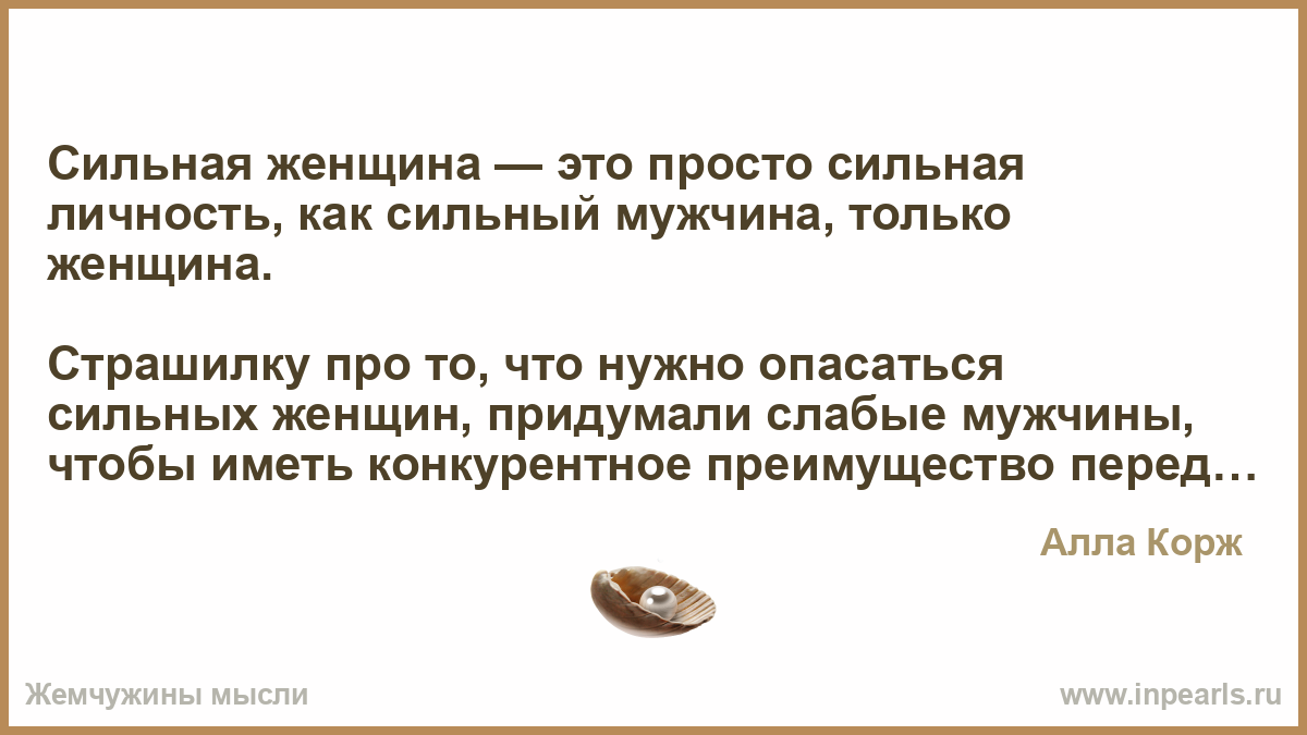 Страшилку про то, что нужно опасаться сильных женщин, придумали слабые мужчины, чтобы иметь конкурентное преимущество перед сильными мужчинами.