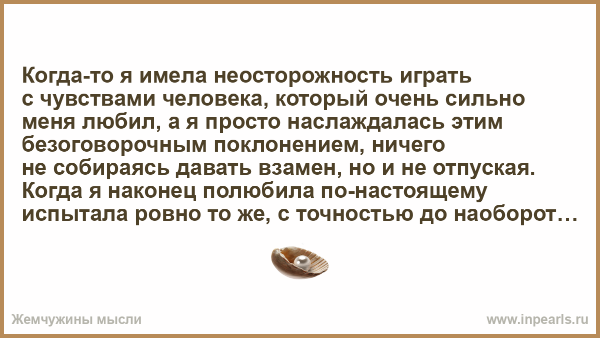 Когда-то я имела неосторожность играть с чувствами человека, который очень сильно меня любил, а я просто наслаждалась этим безоговорочным поклонением, ничего не собираясь давать взамен, но и не отпуская. Когда я наконец полюбила по-настоящему испытала ровно то же, с точностью до наоборот. Берегите чувства, прошу вас очень!
