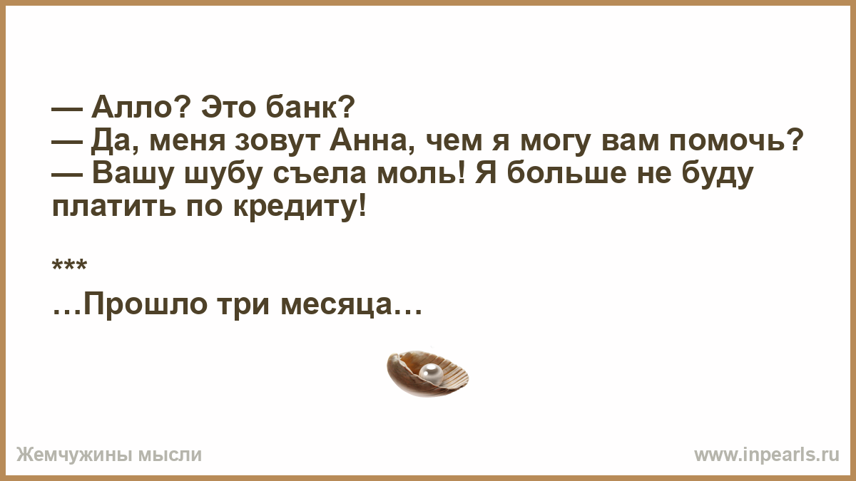 — Ваша честь! Если оператор банка не компетентна в таких вопросах, почему она не перевела меня на специалиста банка, отвечающего за межсезонное хранение шуб?