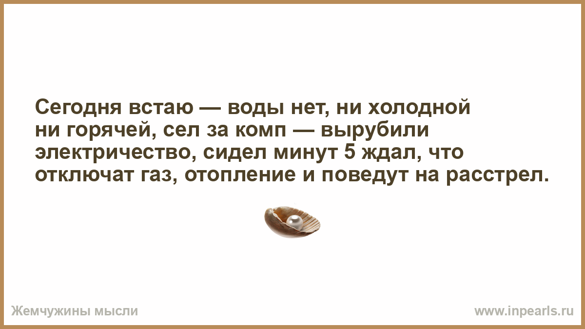 Сегодня встаю — воды нет, ни холодной ни горячей, сел за комп — вырубили электричество, сидел минут 5 ждал, что отключат газ, отопление и поведут на расстрел.
