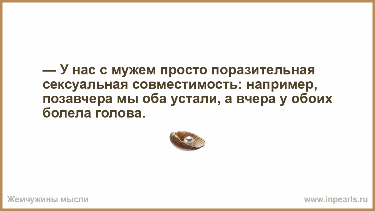 — У нас с мужем просто поразительная сексуальная совместимость: например, позавчера мы оба устали, а вчера у обоих болела голова.