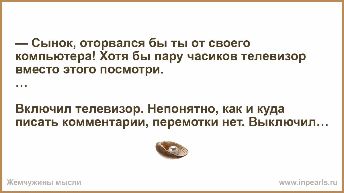 — Сынок, оторвался бы ты от своего компьютера! Хотя бы пару часиков телевизор вместо этого посмотри.