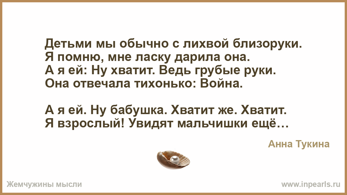 А я ей. Ну бабушка. Хватит же. Хватит.