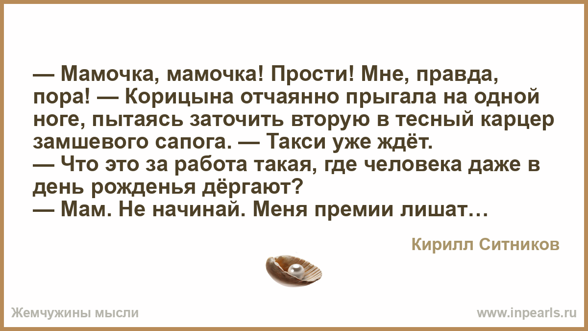 — Мамочка, мамочка! Прости! Мне, правда, пора! — Корицына отчаянно прыгала на одной ноге, пытаясь заточить вторую в тесный карцер замшевого сапога. — Такси уже ждёт.