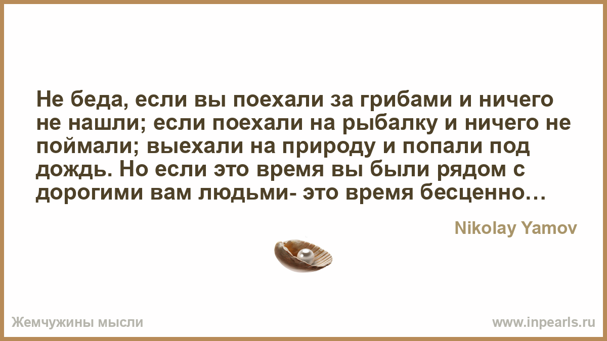 Не беда, если вы поехали за грибами и ничего не нашли; если поехали на рыбалку и ничего не поймали; выехали на природу и попали под дождь. Но если это время вы были рядом с дорогими вам людьми- это время бесценно…