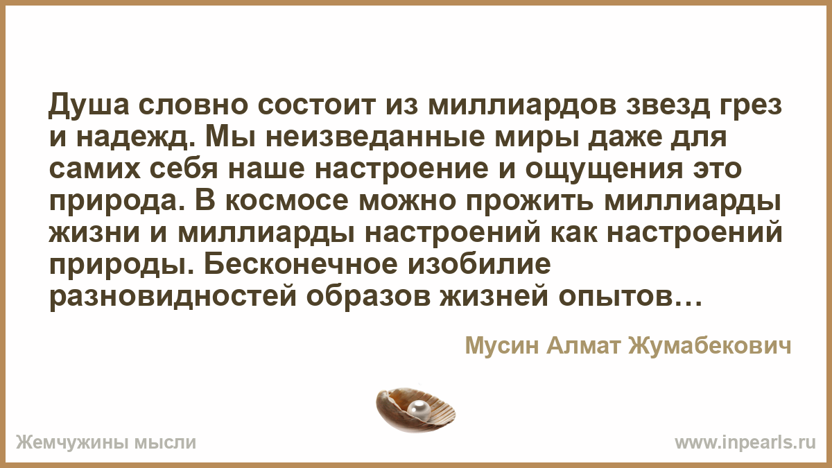 Душа словно состоит из миллиардов звезд грез и надежд. Мы неизведанные миры даже для самих себя наше настроение и ощущения это природа. В космосе можно прожить миллиарды жизни и миллиарды настроений как настроений природы. Бесконечное изобилие разновидностей образов жизней опытов, вселенная убаюкивает нас грезами и глубиной познаний.