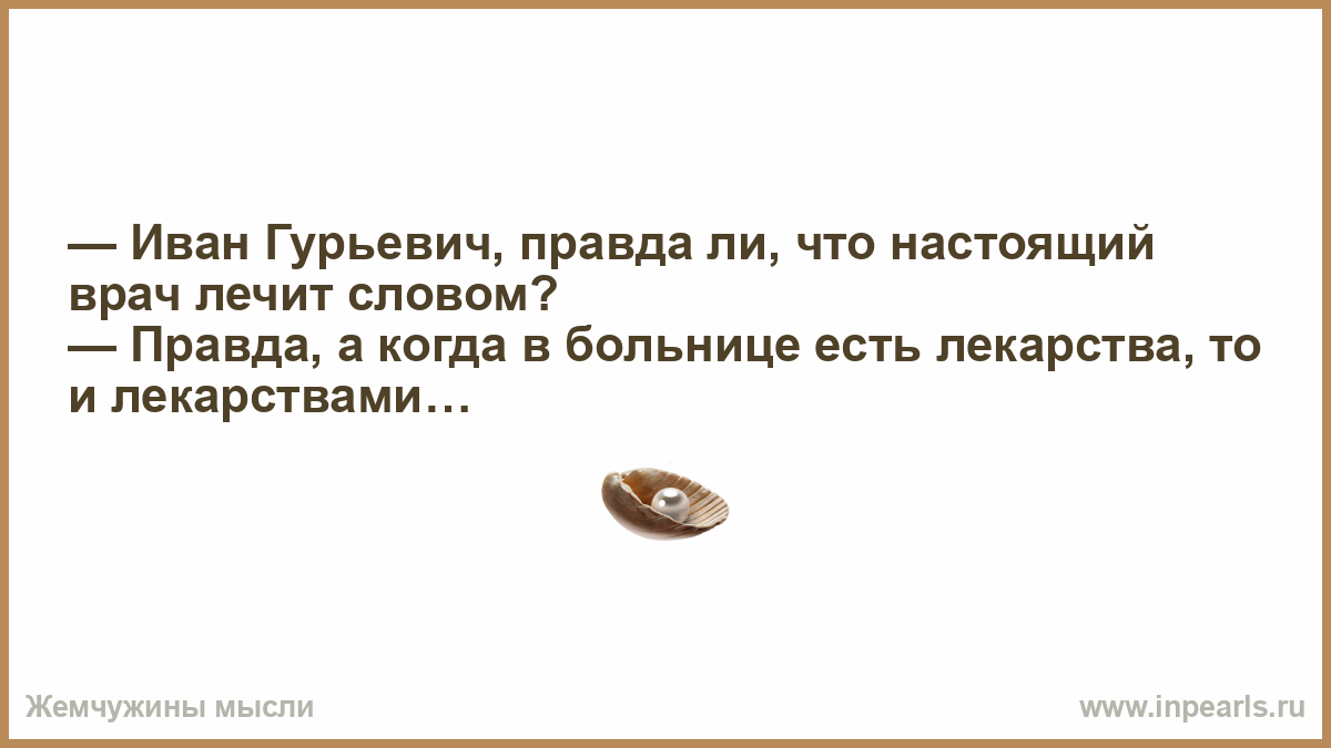 — Иван Гурьевич, правда ли, что настоящий врач лечит словом? — Правда, а когда в больнице есть лекарства, то и лекарствами…