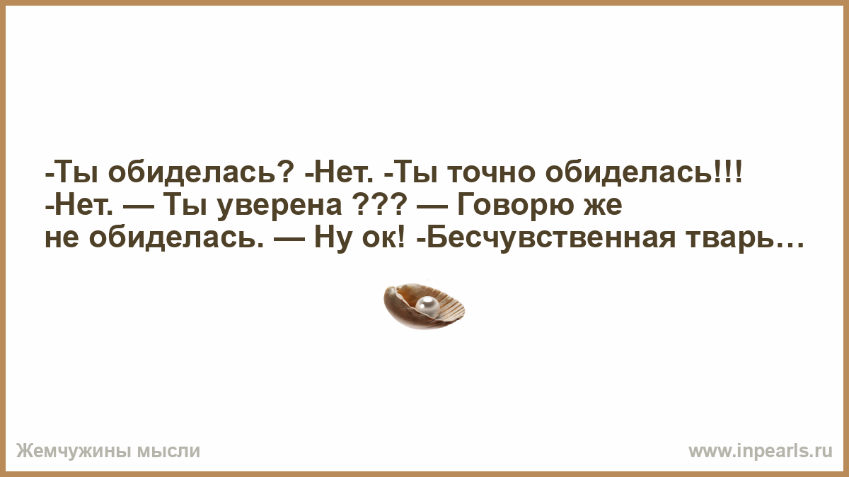 -Ты обиделась? -Нет. -Ты точно обиделась!!! -Нет. — Ты уверена ??? — Говорю же не обиделась. — Ну ок! -Бесчувственная тварь…