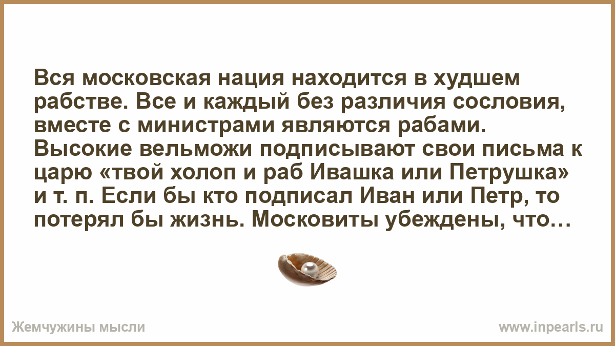 Вся московская нация находится в худшем рабстве. Все и каждый без различия сословия, вместе с министрами являются рабами. Высокие вельможи подписывают свои письма к царю «твой холоп и раб Ивашка или Петрушка» и т. п. Если бы кто подписал Иван или Петр, то потерял бы жизнь. Московиты убеждены, что вся их страна со всеми богатствами и со всеми людьми является частной собственностью царя, и он имеет божественное право делать, что захочет, с поместьями и людьми. Московиты не имеют простых моральных устоев. Учиться от чужаков хоть приличному поведению не хотят, считая свое лучшим. Эта нация, родившаяся и воспитанная в рабстве, бесится, когда хоть немного ослабляется деспотия царя. Москвиты покорны только если взнузданны и в ярме … Высшие сословия, хотя и сами рабы, обращаются с низким, как с рабами. Не имея простейшей культуры, московиты считают обман наибольшей мудростью. Во лжи они не знают ни границ, ни малейшего стыда. Обыкновенные человеческие добродетели такие чужие, непонятные московитам, что они подлость считают за высокую добродетель … Этот народ ненавидит свободу, протестует, если ему набрасывают ее. Московские воины по собственной воле, без приказа любят жестоко издеваться, пытать заключенных. В Московии всегда и везде можно за небольшие деньги найти лживых свидетелей, которые поклянутся на кресте и Евангелии в церкви. Даже у турок нет такого гадкого лакейства перед высшими и такого жестокого издевательства над низшими, беззащитными.