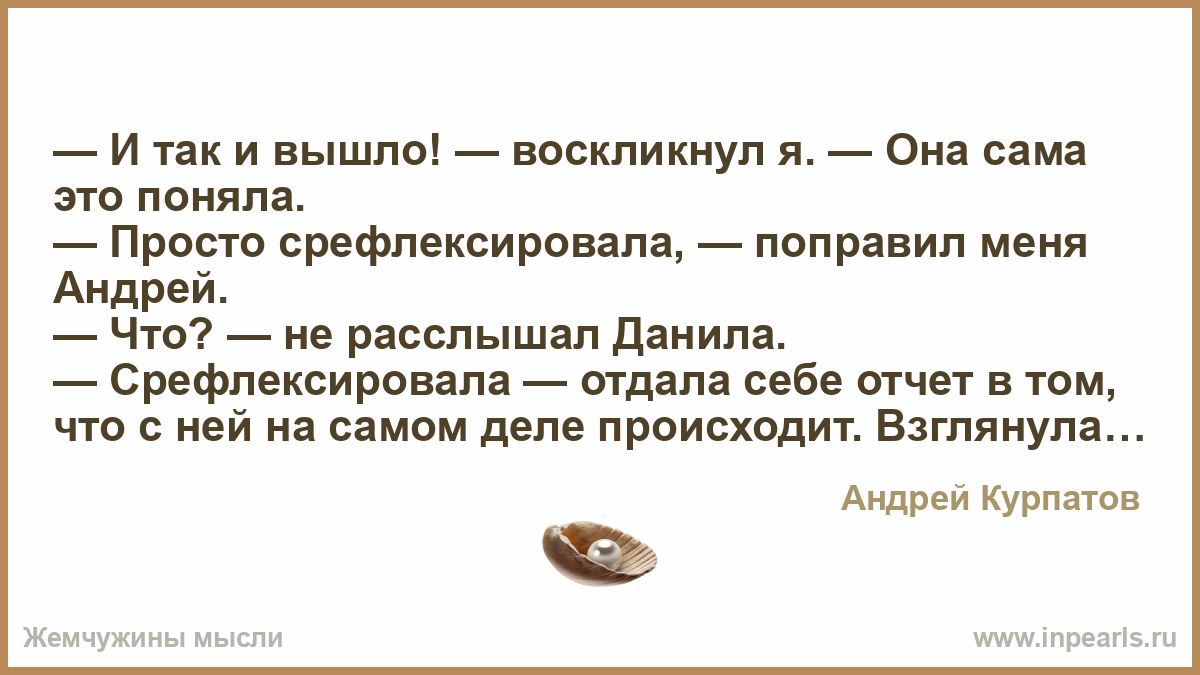 — Срефлексировала — отдала себе отчет в том, что с ней на самом деле происходит. Взглянула на себя с другой стороны. Обычно мы смотрим на себя с какой-то определенной точки зрения. И многого не видим, не замечаем, не понимаем, а рефлексируя, то есть отдавая себе отчет в собственном поведении — мыслях, чувствах, реакциях, — мы видим эти «слепые пятна».