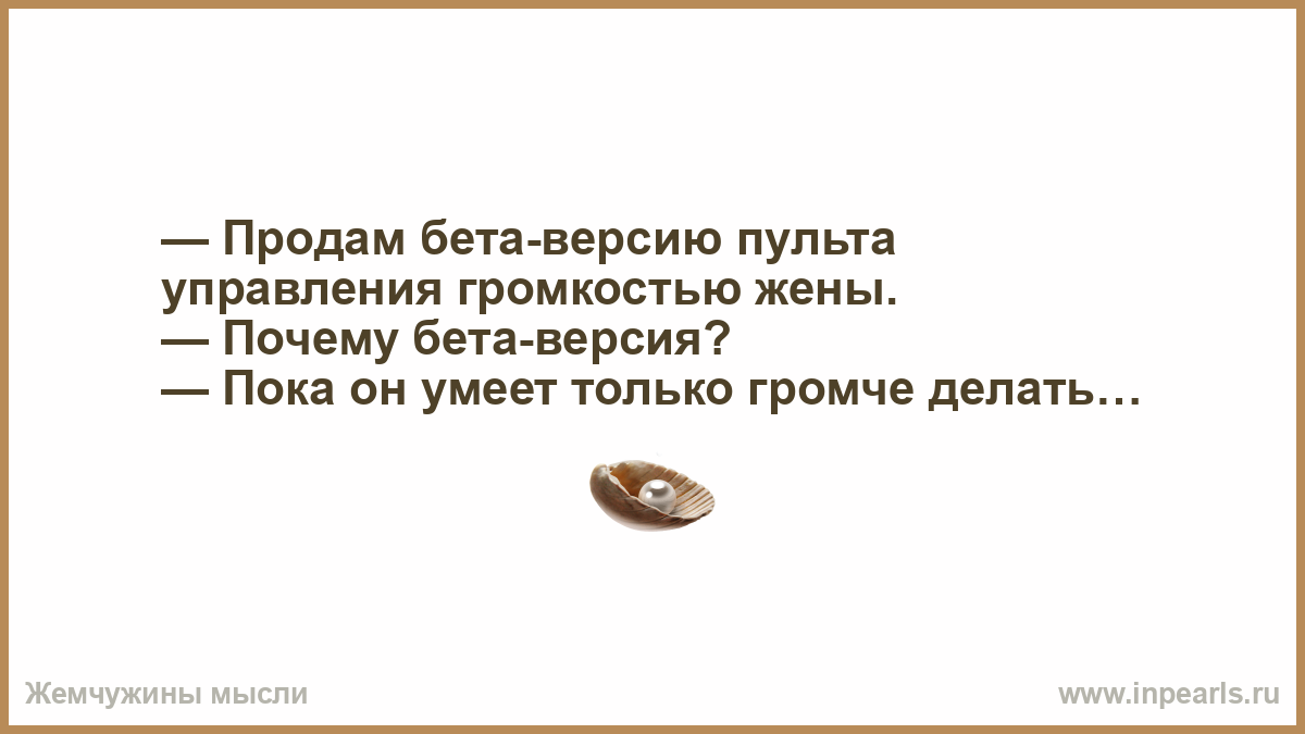 — Продам бета-версию пульта управления громкостью жены. — Почему бета-версия? — Пока он умеет только громче делать…