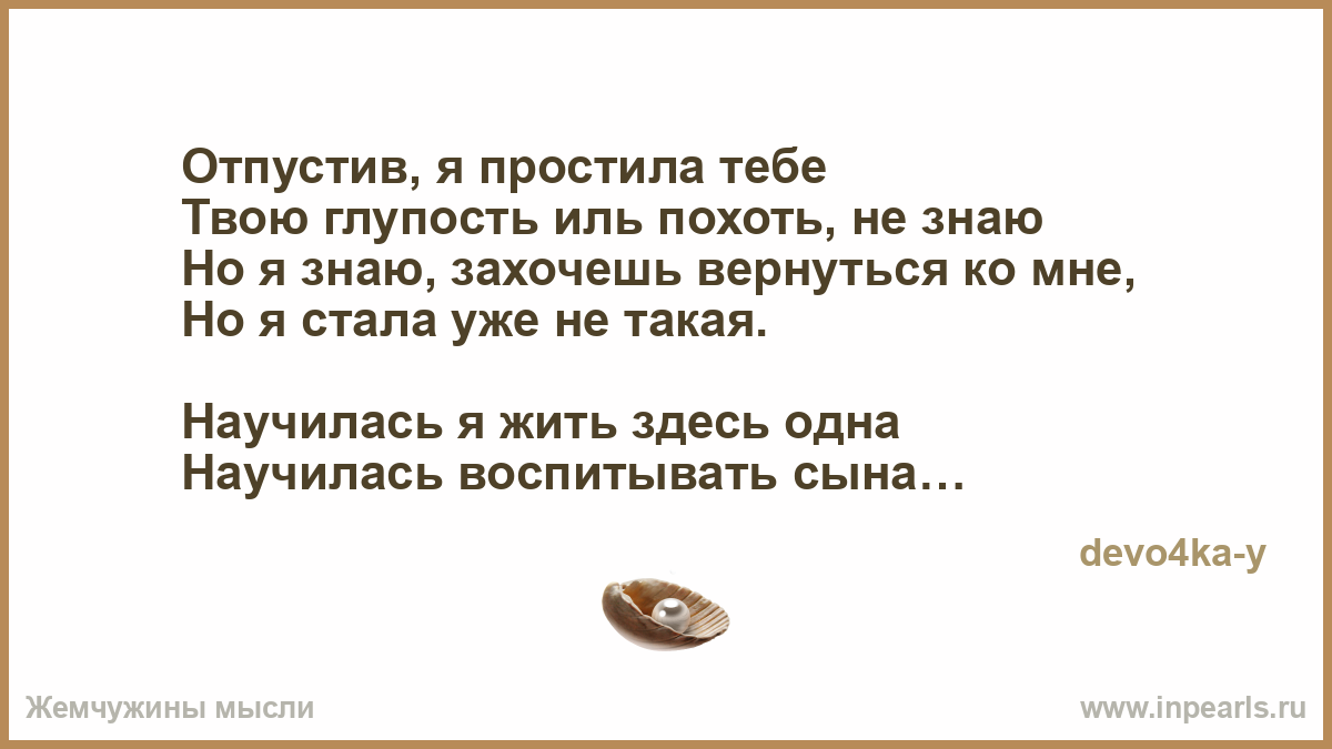 «Зачем ты тащишь за собой целый обоз из своих несчастий? Зачем гордишься своей мукой? Ты хочешь сказать, что это делает тебя сильной? Неправда. Ты живешь своим прошлым только потому, что боишься будущего. Ты думаешь, что сила человека в его опыте, в пережитой боли? Ну что ж, тогда умри, чтобы у тебя был весь опыт! Только, что с ним делать покойнику?.. Сила в тебе, а не в твоем прошлом. И ты нужна без всякой причины. Просто потому, что ты нужна.» Исповедь Люцифера