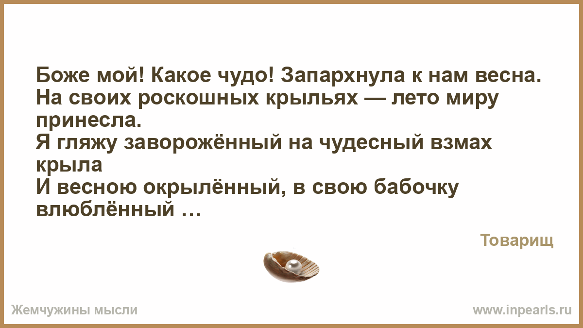 Боже мой! Какое чудо! Запорхнула к нам весна. На своих роскошных крыльях — лето миру принесла. Я гляжу заворожённый на чудесный взмах крыла И весною окрылённый, в свою бабочку влюблённый — В лето перепрыгнул я!