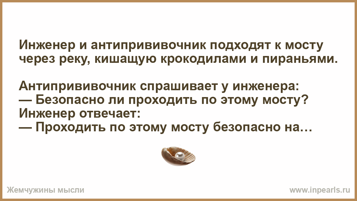 Инженер и антипрививочник подходят к мосту через реку, кишащую крокодилами и пираньями.