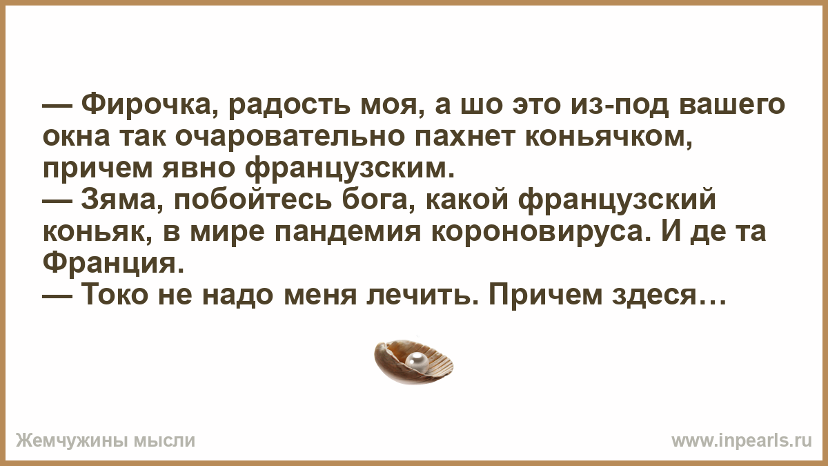 — Фирочка, радость моя, а шо это из-под вашего окна так очаровательно пахнет коньячком, причем явно французским.