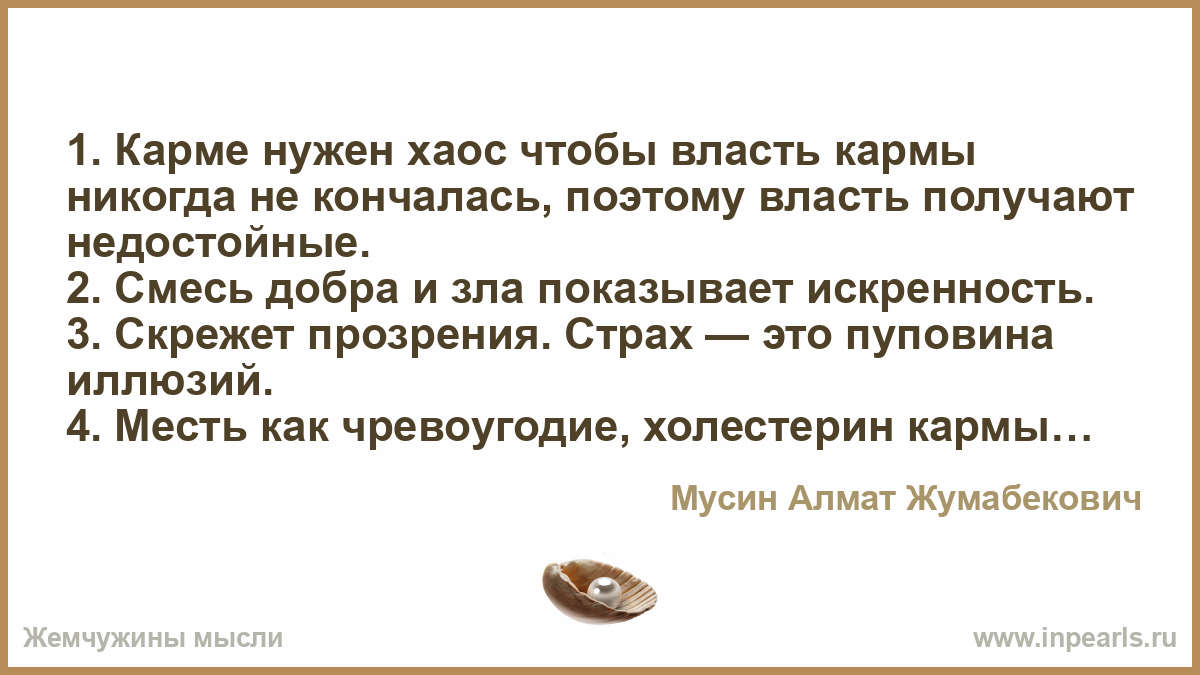 1. Карме нужен хаос чтобы власть кармы никогда не кончалась, поэтому власть получают недостойные. 2. Смесь добра и зла показывает искренность. 3. Скрежет прозрения. Страх — это пуповина иллюзий. 4. Месть как чревоугодие, холестерин кармы повышается.