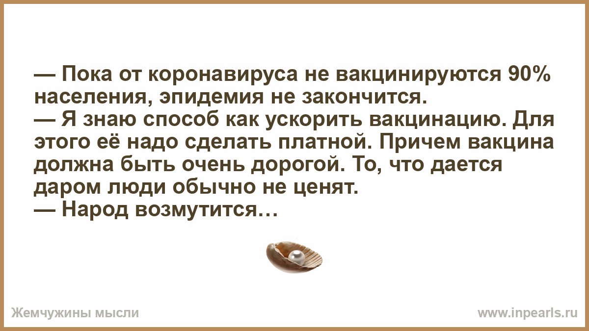 — Я знаю способ как ускорить вакцинацию. Для этого её надо сделать платной. Причем вакцина должна быть очень дорогой. То, что дается даром люди обычно не ценят.