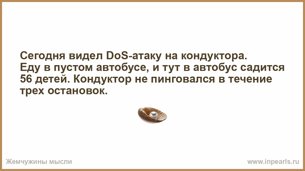 Сегодня видел DоS-атаку на кондуктора. Еду в пустом автобусе, и тут в автобус садится 56 детей. Кондуктор не пинговался в течение трех остановок.
