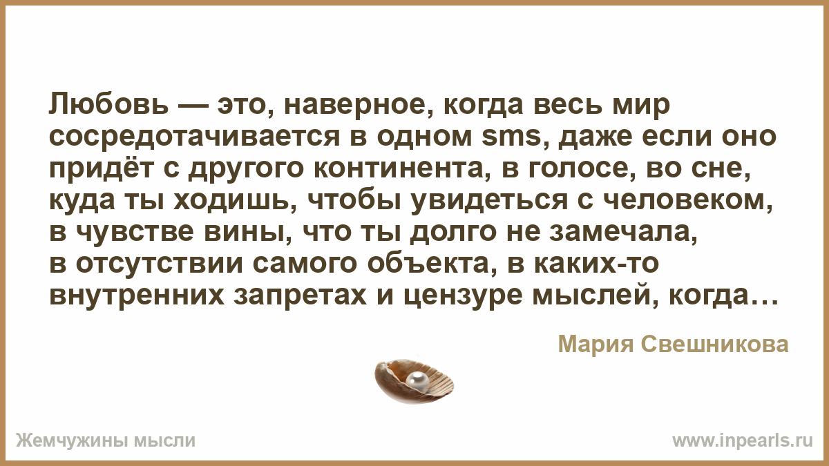 Любовь — это, наверное, когда весь мир сосредотачивается в одном sms, даже если оно придёт с другого континента, в голосе, во сне, куда ты ходишь, чтобы увидеться с человеком, в чувстве вины, что ты долго не замечала, в отсутствии самого объекта, в каких-то внутренних запретах и цензуре мыслей, когда уходит свобода блядства и ты остаешься одна за решеткой собственных чувств. И нет телефона. И нет службы спасения.