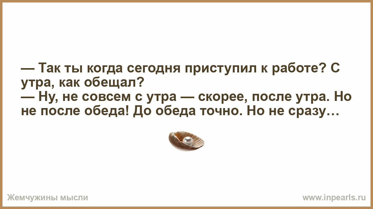 — Так ты когда сегодня приступил к работе? С утра, как обещал? — Ну, не совсем с утра — скорее, после утра. Но не после обеда! До обеда точно. Но не сразу…