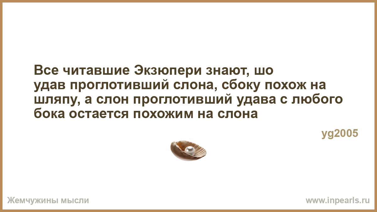 Все читавшие Экзюпери знают, шо удав проглотивший слона, сбоку похож на шляпу, а слон проглотивший удава с любого бока остается похожим на слона