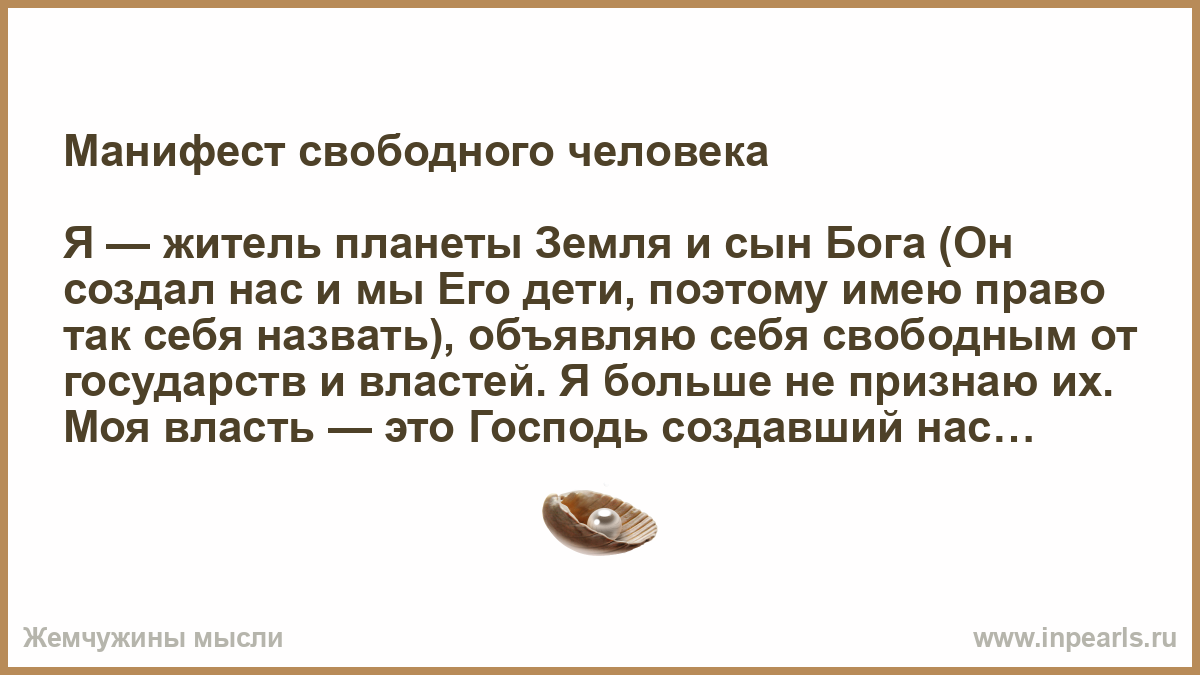 Я — житель планеты Земля и сын Бога (Он создал нас и мы Его дети, поэтому имею право так себя назвать), объявляю себя свободным от государств и властей. Я больше не признаю их. Моя власть — это Господь создавший нас, доброта и совесть данная Им.