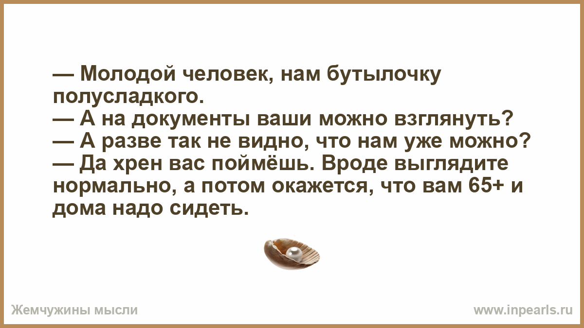 — Молодой человек, нам бутылочку полусладкого. — А на документы ваши можно взглянуть? — А разве так не видно, что нам уже можно? — Да хрен вас поймёшь. Вроде выглядите нормально, а потом окажется, что вам 65+ и дома надо сидеть.